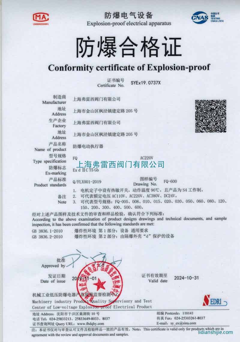 弗雷西防爆電動頭獲得防爆證書認可