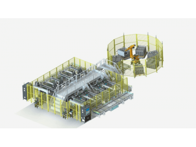 ● 下料堆垛:采用ABB或庫卡六軸機(jī)器人,對不同檔位的電池托盤進(jìn)行堆垛到棧板上,后續(xù)由人工叉車或者AGV小車出料;