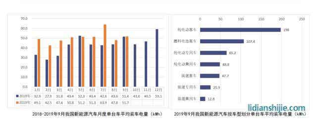 從單臺車平均裝車電量情況來看,2019年9月,受新能源客車產(chǎn)量小幅上升帶動,我國新能源汽車按車型劃分的平均裝車電量51.7.8kWh,環(huán)比上升8.2%。