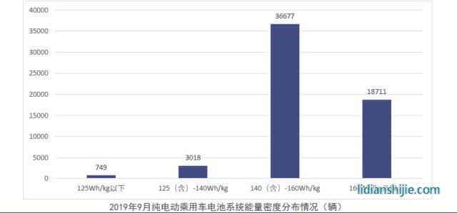 純電動乘用車電池系統(tǒng)能量密度分布來看,2019年9月,我國純電動乘用車系統(tǒng)能量密度在160Wh/kg及以上區(qū)間產(chǎn)量共計1.9萬輛,占純電動乘用車總產(chǎn)量由26.3%上升至31.6%;在125(含)-140Wh/kg和140(含)-160Wh/kg以上區(qū)間的車型產(chǎn)量分別為0.3萬輛和3.7萬輛,分別占純電動乘用車總產(chǎn)量5.1%和62%。