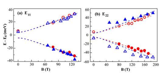 圖3. (6, 4)(6, 5)碳納米管E11(左)和E22(右)子能帶中明暗激子能量與外加磁場之間關系