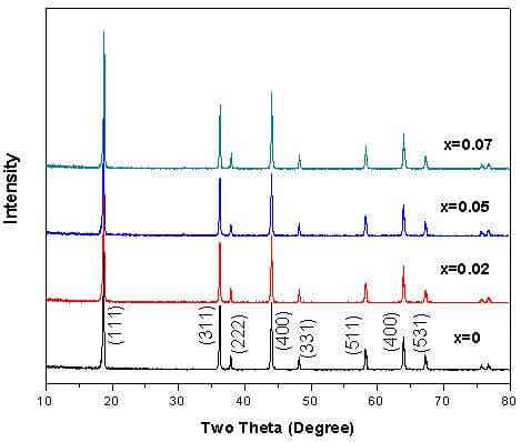 Table 1 Lattice parameters and unit cell volume of the LiMn2-xGaxO4(x = 0,、0.02,、0.05、0.07) cathode materials