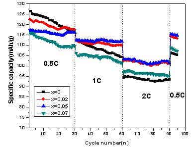 ( x = 0、 0.02、0.05、 0.07) at 0.5C rate