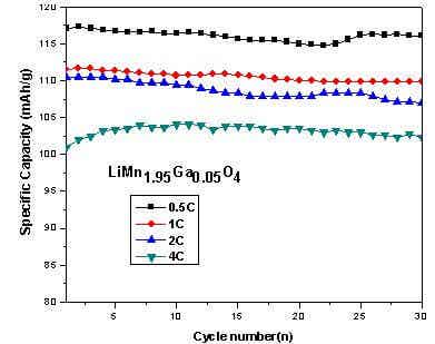 (3)考察了Ga摻雜量為5mol%的LiMn1.95Ga0.05O4倍率性能,分別在1C,2C,4C下充放電循環(huán)30次,首次容量為111.5、110.5、100.9 mAh/g,容量保持率為98.2、96.8、101.4%,表明摻雜材料具有優(yōu)異的倍率性能。