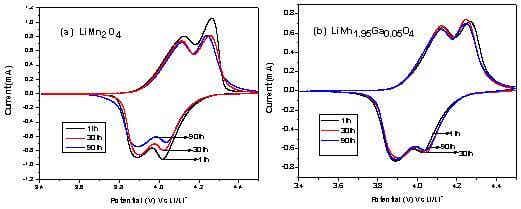 between 3.4 and 4.5V at a scan rate of 0.153mV/s; (a) LiMn2O4, (b) LiMn1.95Ga0.05O4
