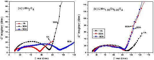 Fig.9 Electrochemical impedance spectra of LiMn2O4 and LiMn1.95Ga0.05O4