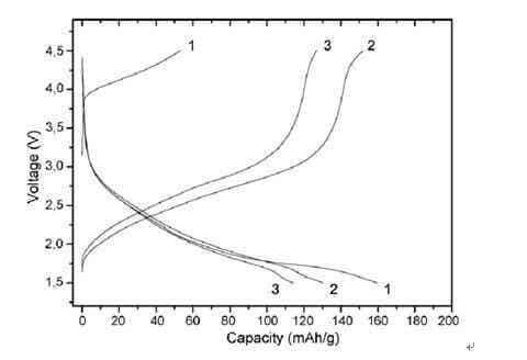 Suresh等[21]采用前驅體NaFe0.8Co0.1O2在正己醇中和過量的LiBr通過離子交換獲得層狀LiFe0.8Co0.1O2,在1.54.5V電壓范圍內其初始放電容量為205mAh/g30次循環后容量仍保持為190mAh/g,其良好的電化學性能或得益于Co對材料層狀結構的穩定作用。