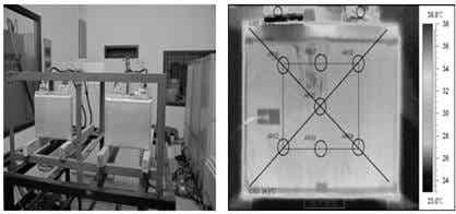 用熱成像設備測試了電池在200A電流下放電和100A電流下充電時表面的溫升情況,如圖4、5所示。