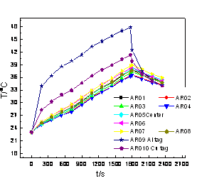 其中,熱成像結果顯示的顏色不同顯示溫度的變化情況。對試驗過程中電池的表面溫度取圖中所示的10個區域,分別用AR1、AR2、AR3、AR4、AR5、AR6、AR7、AR8、AR9、AR10標記。