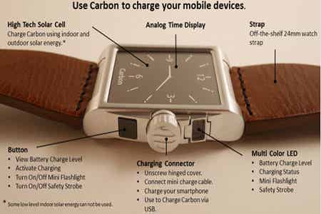 Carbon是一款與眾不同的智能手表,與其他產品不同的是,它還可以為你的智能手機充電。它內置了一個太陽能充電板和800毫安時的電池,可以在室外及擁有自然光照的室內吸收太陽能。當你的智能手機沒電時,Carbon可以用來應急充電,當然不能把手機充滿。