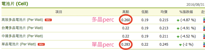 所幸,中國“領跑者計劃”需采用高效電池,單、多晶perc產品近期詢問度高,雖臺灣省perc量產的量、與效率首屈一指,但一般電池的跌幅也帶動perc價格跌價明顯,目前轉換效率20.8%的單晶perc價格已到US$0.28/W上下,多晶perc則約在US$0.255~0.26/W之間。
