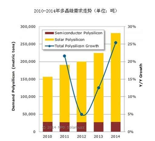鋰電世界 根據最新NPD Solarbuzz多晶硅和硅片供應鏈季度報告Polysilicon and Wafer Supply Chain Quarterly顯示,2014年太陽能和半導體級多晶硅需求預計將大幅上漲至282,000噸,比去年增加25%。多晶硅需求大幅上漲的主要原因是終端市場光伏組件出貨量的增加,2014年太陽能光伏組件出貨量預計將達到近49GW。