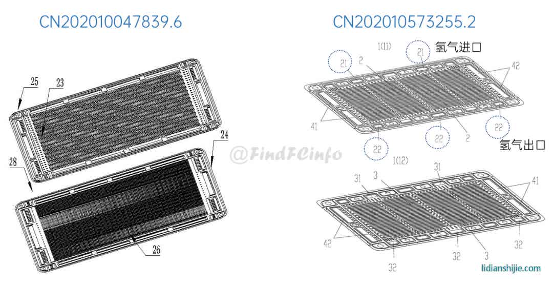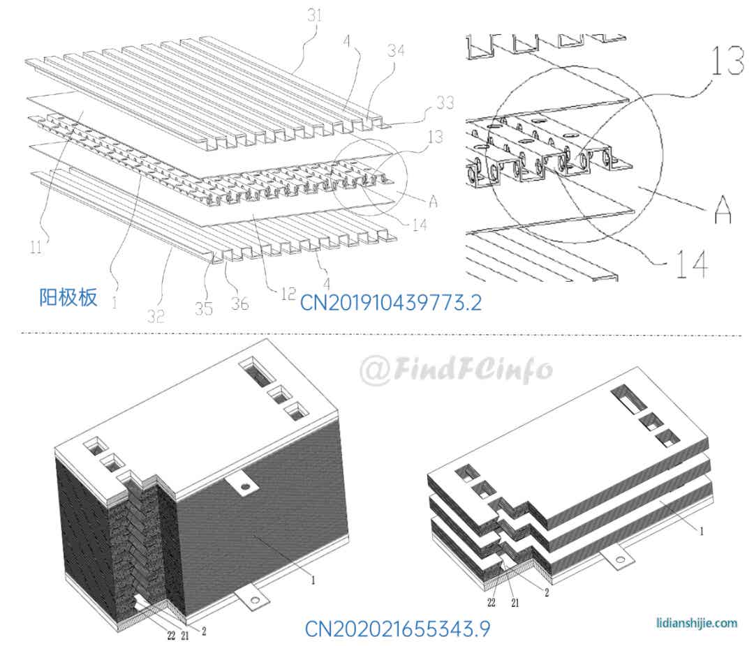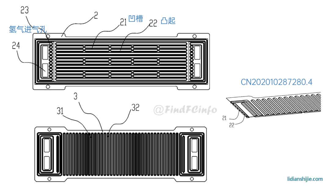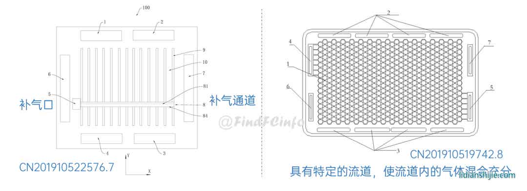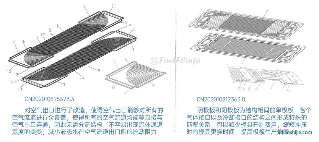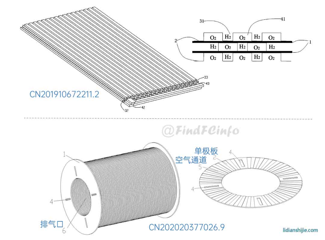 另外,格力還公開了兩種風冷型電堆,如專利CN201910672211.2公開的電堆中,膜電極和單極板在電池單元疊置方向間隔交錯設置,每一單極板的兩側分別形成陽極氣體槽道和陰極氣體槽道,相比于現有常規金屬雙極板燃料電池結構,該電堆厚度能大約降低一半,極板兩側分別為陽極氣體和陰極氣氣體的流動空間。專利CN202020377026.9中電堆增加了進風區域面積,形成了更加均勻的進風結構,有利于提高陰極反應氣體傳質、提高陰極反應氣體流量、降低其流動阻力等。