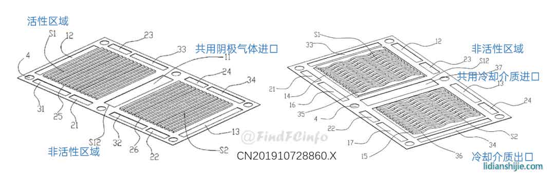 在提高電堆功率密度方面,專利CN201910728860.X公開了在極板上形成兩個活性區域,且兩個活性區域共用一個非活性區域,從而提高了活性區域的占比以及非活性區域的利用率,使燃料電池結構更加緊湊,提高了電池功率密度。