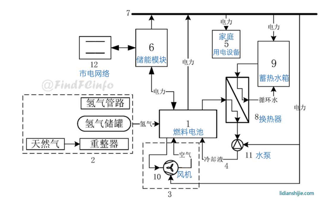 專利CN202020515628.6公開了一種家用熱電聯供系統,其中蓄熱模塊能夠回收燃料電池的廢熱,并將熱能提供給家庭使用;儲能模塊能夠接收并存儲燃料電池的電能;直流供電模塊能夠將燃料電池和儲能模塊提供的電能輸送給家庭用電設備。
