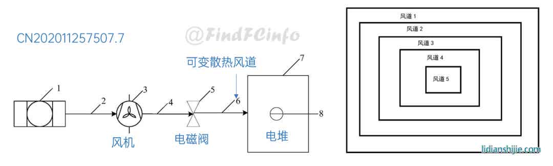 在燃料電池熱管理方面,格力公開的專利既涉及風冷型電堆,也涉及到水冷型電堆。在風冷型電堆熱管理上,專利CN202011257507.7通過在電堆和風機之間設置可變散熱風道,利用控制器調整可變散熱風道上多個散熱子風道的開啟數量或關閉數量,來實現對電堆的精準控溫。
