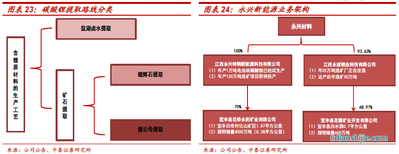 依托國內(nèi)自有礦山、走鋰云母提鋰道路:碳酸鋰生產(chǎn)工藝主要包括鹽湖提鋰以及礦石提鋰,目前國內(nèi)多采用固體礦石提取工藝,具體又分為鋰輝石提鋰和鋰云母提鋰。鋰輝石中的鋰含量通常高于鋰云母,更適合用于生產(chǎn)含鋰原材料。但是,鋰輝石礦在國內(nèi)的資源量少,主要依賴于從澳大利亞等地區(qū)進(jìn)口,運(yùn)輸成本高,供應(yīng)保障穩(wěn)定性相對不足,致使電池級碳酸鋰生產(chǎn)成本居高難下。為了保證原材料最大程度的可控,永興依托收購的國內(nèi)礦產(chǎn)資源,堅(jiān)定走鋰云母提鋰道路。目前公司已經(jīng)擁有兩大礦業(yè)公司-花橋礦業(yè)和花鋰礦業(yè),礦區(qū)地處江西宜春,素有“亞洲鋰都”之稱,探明鋰云母氧化鋰總儲量約250萬噸, 占全國氧化鋰資源的15.2%,占全國礦山鋰資源的62.1%。永拓和花鋰礦業(yè)最新原礦探明儲量分別達(dá)到4500萬噸及600萬噸,年選礦能力120萬噸、50萬噸。兩大礦業(yè)公司的存在,為公司碳酸鋰業(yè)務(wù)的發(fā)展打下了堅(jiān)實(shí)基礎(chǔ);