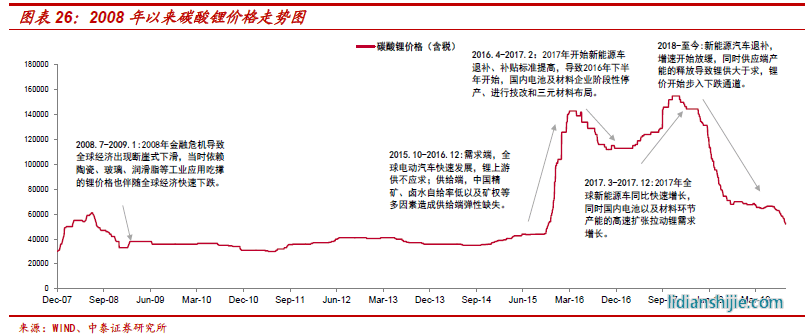 鋰價(jià)有望觸底回升:結(jié)合上文的分析,一方面是行業(yè)新增供給大幅放緩,高成本企業(yè)接連虧損;另一方面,以新能源汽車和3C數(shù)碼為代表的鋰電池推動行業(yè)需求的增速再次躍升,未來行業(yè)供給過剩態(tài)勢有望得以緩解。經(jīng)歷兩年的持續(xù)回落之后,鋰價(jià)在明年某個(gè)段將逐步企穩(wěn),而一旦考慮到產(chǎn)業(yè)鏈補(bǔ)庫因素,行業(yè)將重新轉(zhuǎn)向緊平衡狀態(tài),其價(jià)格轉(zhuǎn)折時(shí)點(diǎn)或得以提前;