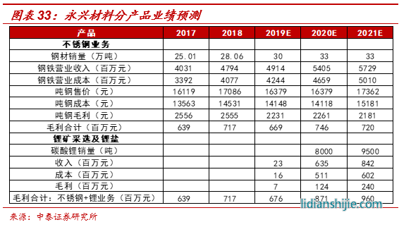 重要假設(shè):(1)不銹鋼銷量2019-2021年分別達(dá)到30萬噸、33萬噸、33萬噸;(2)2020年碳酸鋰均價(jià)54000元,2021年碳酸鋰均價(jià)上行至64800元;(3)2020-2021年公司碳酸鋰銷量分別達(dá)到8000噸、9500噸水平;