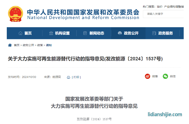 據(jù)國家發(fā)展改革委網(wǎng)站10月30日消息,國家發(fā)展改革委、工業(yè)和信息化部、住房城鄉(xiāng)建設(shè)部、交通運輸部、國家能源局、國家數(shù)據(jù)局等六部門日前發(fā)布關(guān)于大力實施可再生能源替代行動的指導意見。