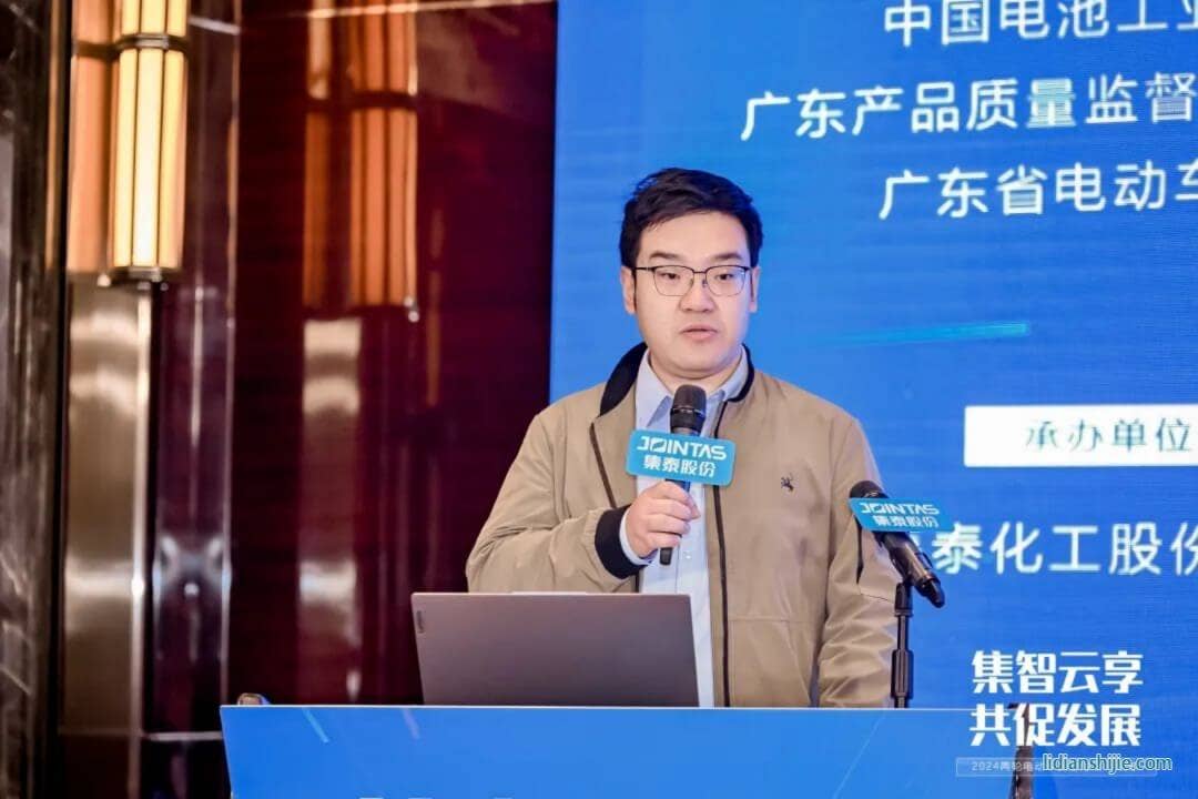二、《電動自行車用鋰離子蓄電池 質量分級評價通則》團體標準發布 廣東質檢院韓健健主任詳細解讀了《電動自行車用鋰離子蓄電池 質量分級評價通則》團體標準的制定背景及其技術指標。他指出,近年來電動自行車火災事故屢見不鮮,不合規的鋰離子蓄電池是引發火災事故主要原因之一,產品質量安全的保障離不開標準的支持與引導。該標準的制定旨在規范電動自行車用鋰離子蓄電池的生產、檢測及評價流程,明確各檔次產品特性和指標,提升產品質量,保障消費者的安全與權益,為鋰離子電池產業轉型升級和結構調整提供技術支撐。 中國電池工業協會王建新副理事長、廣東質檢院黃鎮澤部長、商會藍世有執行會長、億緯鋰能黨奎總監、華立源熊柱德董事長、博力威李光磊主任、星恒沈左松副總攜手為《電動自行車用鋰離子蓄電池 質量分級評價通則》團體標準啟動發布。 集泰化工研究室主任在《兩輪電動自行車鋰電蓄電池 熱失控防護的材料技術方案》主題演講中,展示了電池灌封膠和防火涂層材料在電動車火災防范中的創新應用,通過灌封材料實現對電池包導熱、阻燃、抗震、固定、絕緣、防水等作用,應用防火涂層能減少外部環境對電池包的影響。集泰股份在電池灌封膠領域有突出的優勢,針對電池不同部位的防火需求,研發出導熱、粘接系列產品,并整合防火涂料,推出了膠漆一體化的應用解決方案,能夠在電池熱失控發生時,有效抑制熱量擴散,為逃生留出足夠的時長,減少因火災帶來的人員傷亡損失。
