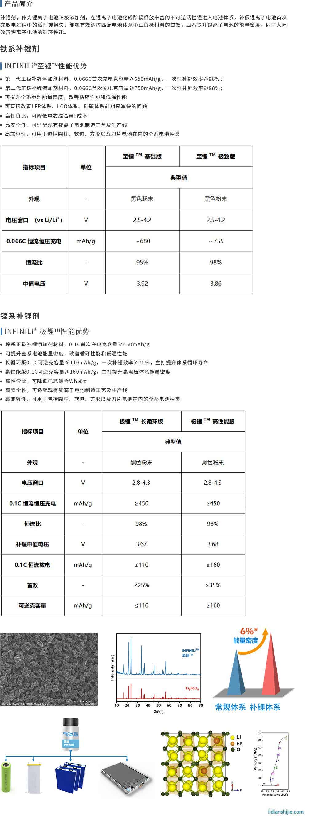 補(bǔ)悝劑, 作為理離子電池正極添加劑, 在理離子電池化成階段釋放豐富的不可逆活性理進(jìn)入電池體系, 補(bǔ)償理離子電池首次充放電過(guò)程中的活性理?yè)p失;能夠有效調(diào)控匹配電池體系中正負(fù)極材料的首效, 顯著提升悝離子電池的能呈密度, 同時(shí)大幅改善捚離子電池的循環(huán)性能。