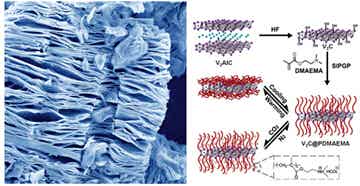 V2CTx屬于MXenes材料中的一種典型二維材料,其晶格常數c值的增加(V2AlC的c值為13.83 Å,V2CTx的c值為19.73 Å 或 23.96 Å)是目前已知的MXenes中最大的,因此V2CTx層間能夠容納更多更大的離子或分子。比如作為鋰離子電池的電極材料,V2CTx在充放電速率為1C和10C時,電容量分別高達280mAhg-1和125mAhg-1,這在所有已知的Mxenes中是最優異的。考慮到有機材料的智能響應性,導電型MXenes無機材料與有機材料雜化將開拓更廣闊的應用空間。多重刺激響應高分子因其在復雜環境中能對兩種或者更多的外界條件做到協同可控響應而受到越來越多的關注。