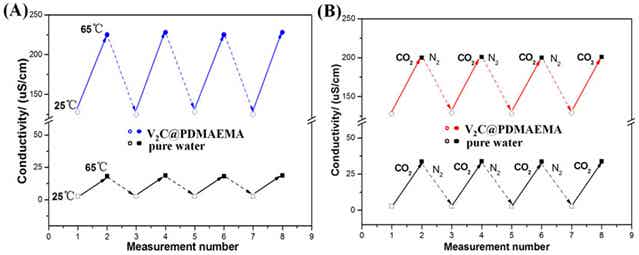 此外,V2C良好的導電性,使得V2C@PDMAEMA對CO2-溫度雙重響應能夠在電導率更加容易地體現。在溫度由25℃和65℃之間轉變時,V2C@PDMAEMA水溶液的電導率從125μS cm−1到225μS cm−1間發生可逆變化,這個變化幅度比純水要大得多(如圖3(a))。CO2和N2的交替鼓入也能使V2C@PDMAEMA水溶液的電導率發生可逆響應。因此該實驗表明通過對電導率的測定,V2C@PDMAEMA可以有助于監測體系中溫度和CO2的濃度,視為一種良好的傳感器材料。
