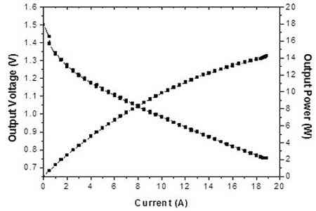 中國科學院寧波材料技術與工程研究所動力鋰電池工程實驗室在優化陰極空氣擴散電極的結構與制備工藝,以及開發高性能的錳氧化物氧還原催化劑的基礎上,成功研制出1000Wh鎂空氣電池樣機,詳見圖1所示。該電池由5個單體電池串聯而成,以AZ31鎂合金為陽極,以10%的NaCl溶液為電解液,以上述空氣擴散電極和錳氧化物催化劑為陰極。該鎂空氣電池的外觀尺寸為200×150×150 mm3,重量為2.3 kg,能量密度可達430 Wh/kg,最大輸出功率可達80W,其單體電池的I-V曲線如圖2所示。上述鎂空氣電池具有較好的商業化前景,可應用為野外供電電源、移動電源、備用電源和應急電源等。