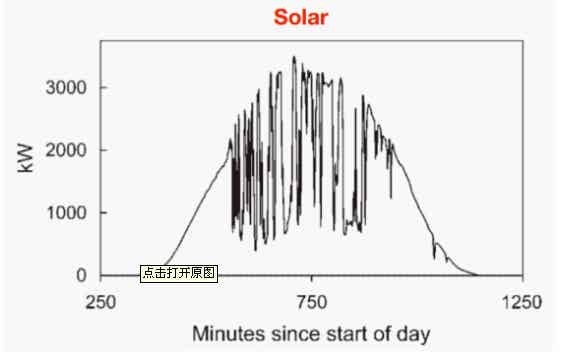 新能源:大部分綠色能源如風能、潮汐能、太陽能等等都有劇烈變化的特點。不僅一天之內各個時間段差別巨大,而且前一分鐘和后一分鐘也差別巨大。由于這種變化太過頻繁(如下圖),用一般的充電電池做儲能設備幾天就報廢了,而超級電容則可以通過暫時存儲幾分鐘的能量,讓整個曲線變得非常平滑。
