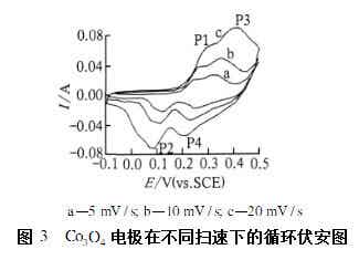 圖3是Co3O4電極在不同掃描速度下的循環伏安圖。由圖3可見,該電極材料在0.3V和0.4V附近有一對明顯的氧化峰,在0.1V和0.2V附近有一對明顯的還原峰,其中,P1峰是Co2+氧化成Co3+的過程,P2峰是其逆過程;P3峰是Co3+氧化成Co4+的過程,P4峰是其逆過程。氧化還原電流較大,可判斷在200℃下熱處理得到的Co3O4電極材料在工作范圍內顯示了較好的電容特性。另外,根據電勢對電流的響應主要依賴于電勢的變化而不依賴于電流,即循環伏安曲線的電流隨著掃描速率的增加而增加,這種對應關系也可以說明該材料有快速充放電特性。