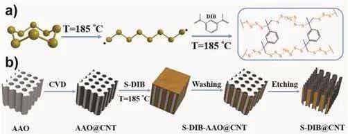 近期,中國科學院金屬研究所沈陽材料科學國家(聯(lián)合)實驗室先進炭材料研究部儲能材料與器件研究組在高性能多組元復合硫電極材料方面開展了系列研究工作。他們首先采用密度泛函理論計算,以氮摻雜石墨烯作為模型,發(fā)現(xiàn)在不同的氮摻雜形式中吡啶氮的團簇能夠較強地吸附多硫化物分子,并提出了組元與多硫化物相互作用的能量判斷關系。在此基礎上,通過氨氣高溫處理氧化石墨烯的方法,獲得了具有優(yōu)異電化學性能、高含氮量的氮摻雜石墨烯。為了進一步提高對多硫化物的限制效果,將碳納米管對多硫化物的物理限制作用與有機硫聚合物中碳-硫鍵對多硫化物的化學限制作用相結合,將有機硫聚合物裝填到陽極氧化鋁為模板合成出的碳納米管中,制備出有機硫聚合物/碳納米管復合材料(圖1)。該復合材料通過碳納米管的管腔物理限制多硫化物溶解,同時利用有機硫聚合物中的碳-硫鍵進行化學方式固定硫,協(xié)同抑制了多硫化物的穿梭效應。
