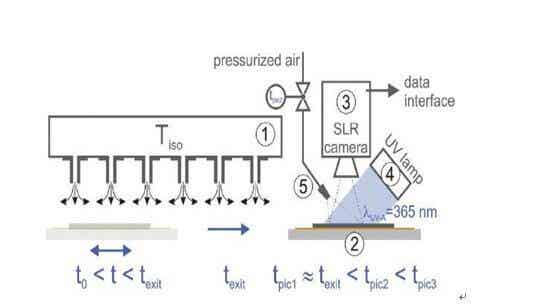 ① 對流槽噴嘴干燥機 ② 溫控板 ③ SLR相機 ④ UV燈 ⑤ 加壓空氣噴嘴
