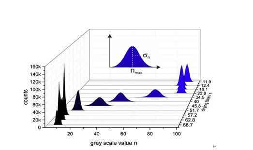 圖2為圖像處理流程,每個圖像都是RGB灰度值疊加照片,首先將照片分割成紅(red)、綠(grenn)、藍(blue)三原色各自的顏色通道。本文中只分析紅色通道,因為藍色在長時間干燥后仍舊飽和狀態,因而缺少最開始的信息,而綠色值強度低,接近零。采用MATLAB對圖像進行處理,讀取每一個像素的灰度值并計數,再做成灰度值高斯分布圖。標準偏差σ和平均灰度值nmax作為圖像處理的特征量,nmax表示涂層表面液體的含量。