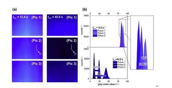 圖5 (a)在兩個干燥時刻,各自連續拍攝的三張照片的比較。捕捉第二張照片時,用加壓空氣噴嘴向照相區域涂層上直接噴射空氣氣流。(b)在較短干燥時間(texit=12.4s)時,三張照片中獲得的nmax都很大,差值Δn12和Δn23小并且都落在試驗值偏差范圍內。而texit=40.0s時,三個nmax都很小,噴嘴作用導致的差值Δn12和Δn23很大。