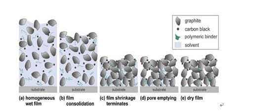(a)溶劑蒸發引起初始均勻濕涂層收縮;(b)溶劑蒸發,石墨顆粒彼此接近;(c)當石墨顆粒獲得最密集的組態時,涂層收縮終止;(d)孔隙消失,溶劑進一步的蒸發導致液相散出多孔電極結構;(e)干燥的電極。