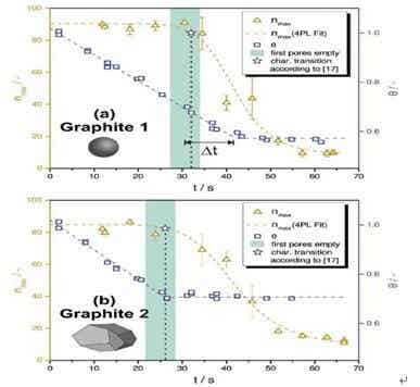 (a)Graphite1(球形,d50=8.9μm),(b)Graphite2(多面體,d50=20.4μm)。從nmax開始減少到平臺結束的時間間隔以以綠色突出顯示,這表明第一個孔洞形成時刻。五角星標記是文獻的轉換時間。