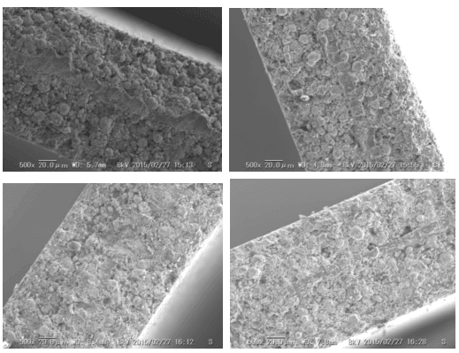 毛刺,特別是金屬毛刺對鋰電池的危害巨大,尺寸較大的金屬毛刺直接刺穿隔膜,導(dǎo)致正負(fù)極之間短路。而極片分切工藝是鋰離子電池制造工藝中毛刺產(chǎn)生的主要過程。圖3所示即為極片分切產(chǎn)生的金屬毛刺的典型形貌,極片在分切時形成了集流體毛刺,尺寸達(dá)到100μm以上。表1是LiFePO4極片分切毛刺實驗結(jié)果,通過切刀倒角、刀具側(cè)向壓力以及收放卷張力的調(diào)節(jié)來控制毛刺的數(shù)量和尺寸。
